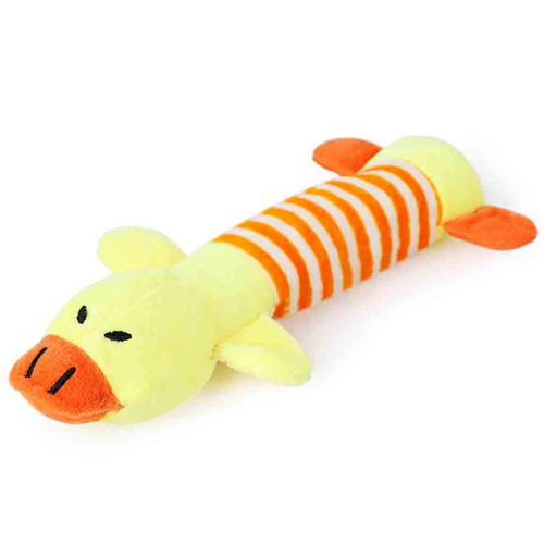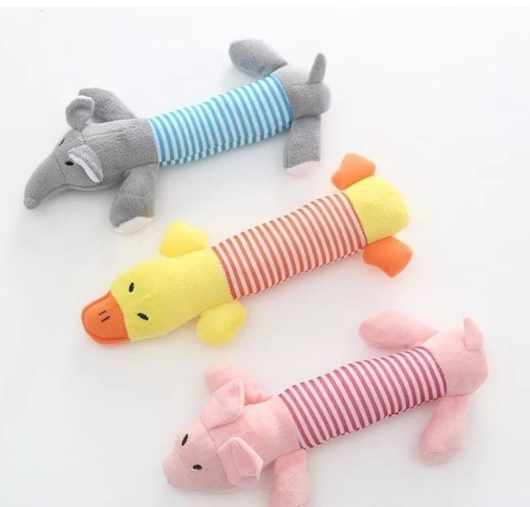 اسباب بازی صدادار سگ و گربه در سه طرح حیوانات (خوک، فیل، اردک). این عروسک حیوانات راه راه با پارچه پولیشی نرم و صدای سوتک، برای تخلیه انرژی و بازی مستقل ایدهآل است.